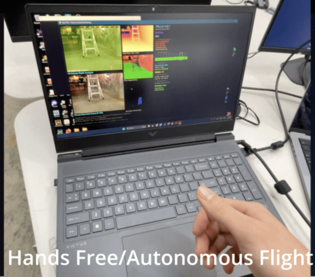 We use an off-the-shelf Tello drone fitted with our autonomy stack. After being given a goal, the drone intelligently and autonomously navigates the surroundings of the user, mapping out the environment and exploring unknown spaces using monocular visual odometry and monocular depth estimation.